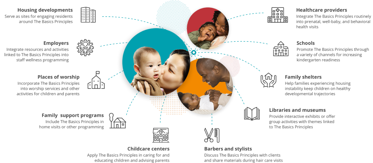 The Basics vision entails communities where family-friendly policies and practices are norms that infuse multiple sectors of an institutional ecosystem. Such an ecosystem engages with families intentionally and relentlessly to alleviate stress and relieve material hardship in support of vibrant caregiver-child relationships that include, among other resources, The Basics Principles.